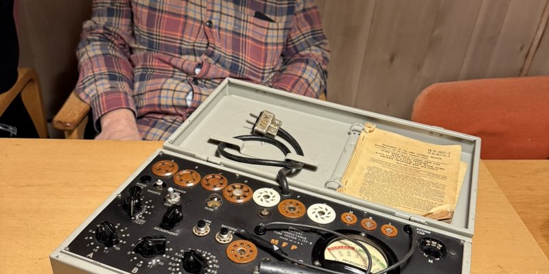 Her er det Jan OZ2JMG der fremviser sin nyindkøbte rørtester i US-militær kvalitet men desværre til 110 Volt, men det skal Jan nu nok få fikset: